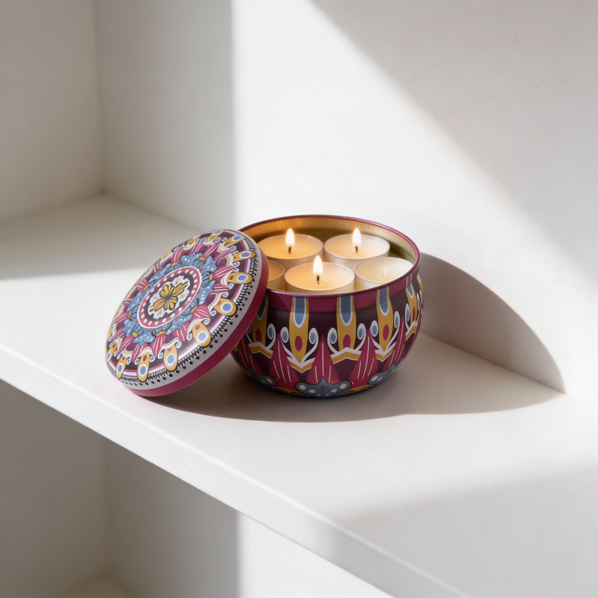 علبة معدنية أنيقة بنقشة ماندالا بمقاس 7.5 × 5 سم، باللون البنفسجي الداكن ومزينة بتصميم أصفر وأزرق، مثالية لتنظيم الشموع، الخرز، والإكسسوارات (سعة 100 جم)